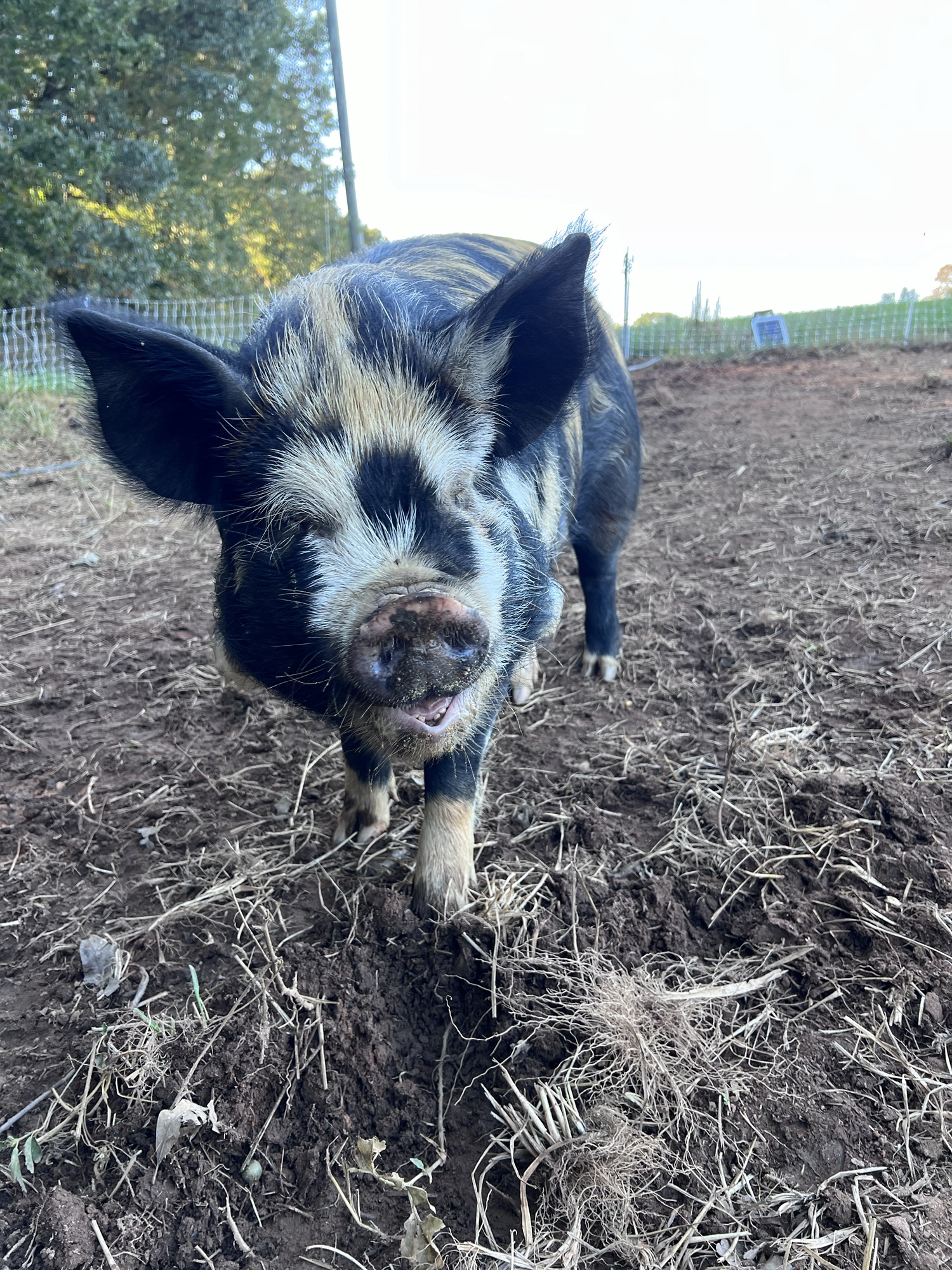 For months, they behaved more like pets, meeting me at the fence, nudging for treats, flopping down for belly rubs and following me around with an eager curiosity. But everything changed in July. With their hormonal shift came a noticeable change in behavior—more aggressive, more food-motivated, less like companions and fully embracing their marvelous pigness as the pastured farm animals they were always meant to be. They tore up structures (apparently pigs love the sound of ripping tarp), rooted where they shouldn’t, and made it increasingly difficult to keep them protected from the elements. The idyllic vision of Idaho Pasture Pigs as gentle grazers proved to be only partially true—once maturity set in, rooting became their favorite pastime (and their natural inclination).
